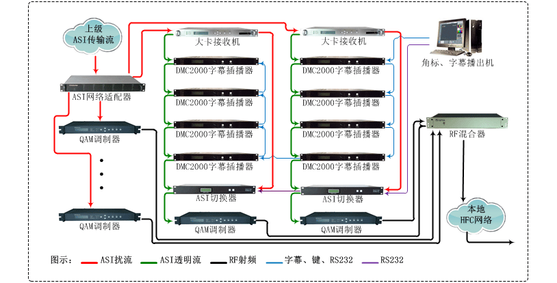 數字有線(xiàn)電視分前端,一般都是上級數字有線(xiàn)網(wǎng)絡(luò )傳送下來(lái)的數字加密流信號。加密流信號是無(wú)法直接插播字幕的,要想在數字分前端插播字幕的話(huà),首先要使用大卡機將加密流信號解密為清流ASI信號,ASI清流信號通過(guò)TS流字幕插播器疊加字幕后再給QAM調制器??墒沁@種方法會(huì )使插播字幕的頻點(diǎn)為開(kāi)放頻道,有線(xiàn)用戶(hù)在不交費的情況下也可以收看。解決的辦法是在QAM調制器前串接一臺ASI切換器,大卡機有2路輸出,可以設置成1路清流,一路為原始加密流,清流經(jīng)過(guò)插播器,加密流直接給ASI切換器。這樣在插字幕時(shí)為不加密狀態(tài),不插字幕是還原為加密狀態(tài)。這樣有線(xiàn)用戶(hù)不交費的情況下也無(wú)法正常收看。