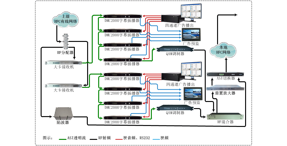 QAM調制器:將經(jīng)過(guò)TS流廣告截播器的ASI透明流信號調制到經(jīng)過(guò)大卡機前的原省網(wǎng)頻點(diǎn)。