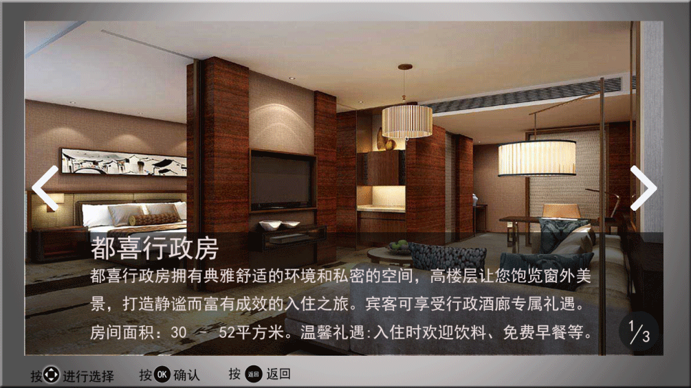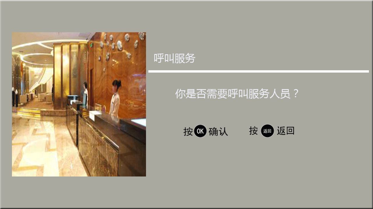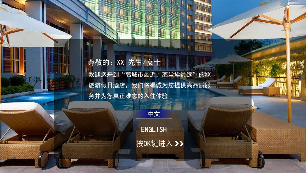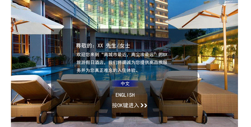 可個(gè)性化定制歡迎界面、生日/節日祝福界面;支持PMS對接顯示客人名字;支持PMS對接,多國語(yǔ)言;支持背景圖片或視頻循環(huán)自動(dòng)播放