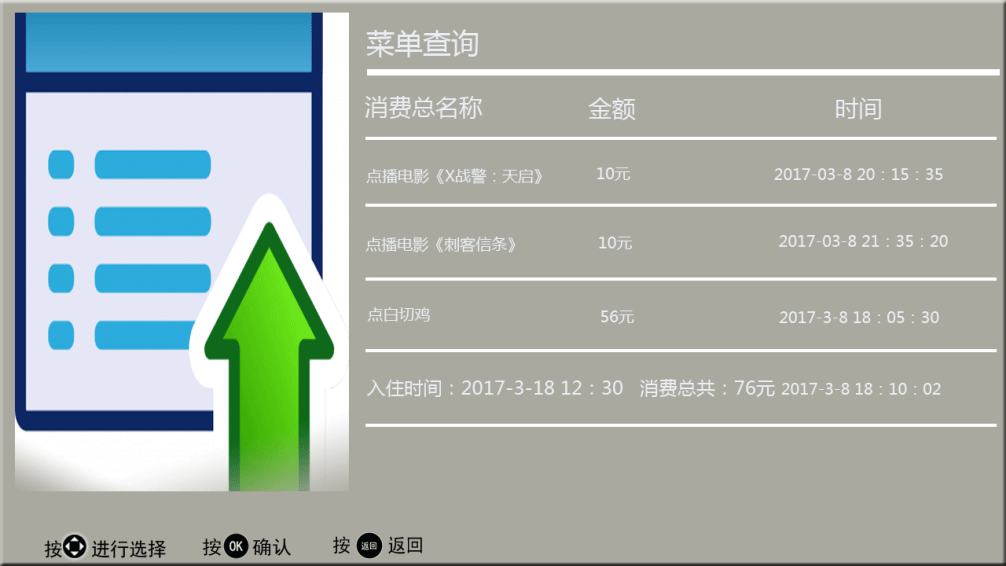 酒店可以在IPTV電視系統中訂購餐飲服務(wù),通過(guò)PMS系統進(jìn)行預定餐飲服務(wù)或送餐廳進(jìn)客房。 |