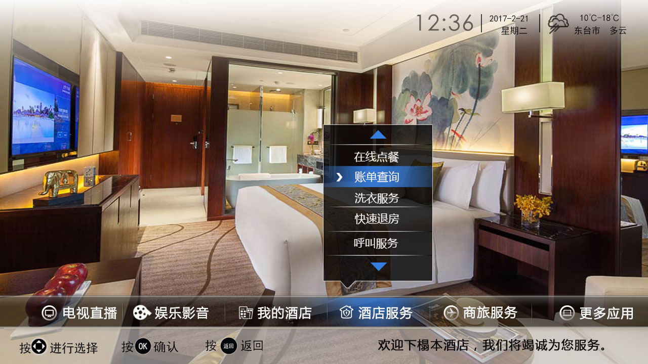 在線(xiàn)送餐與PMS對接;服務(wù)預約與PMS對接;一鍵送物與PMS對接;快速退房與PMS對接;即時(shí)消費賬單查詢(xún)與PMS對接