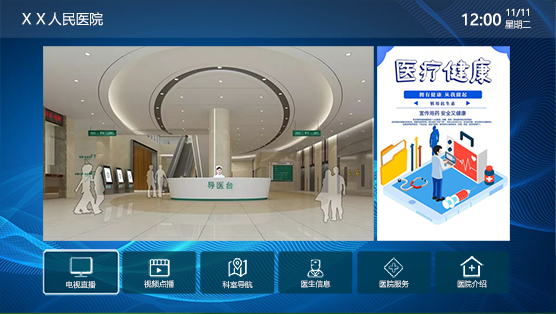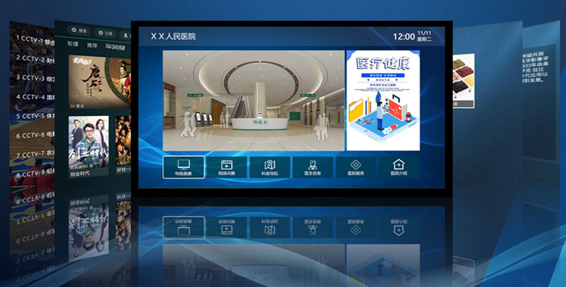 醫院的電視分布在醫院的每個(gè)角落,包括病房、門(mén)診大廳、電梯間、科室辦公室、領(lǐng)導室、各個(gè)科室候診廳等。其中病房對電視機的需求最大,給病房配備IPTV電視系統,讓住院的患者隨時(shí)可以觀(guān)看自己喜歡的節目。但是為避免影響患者休息,醫院的病房IPTV電視系統要做到統一頻道管理、統一音量、定時(shí)開(kāi)關(guān)機、分組權限管控等。從醫院角度而言,醫院希望病房電視不僅能夠進(jìn)行電視節目的觀(guān)看,而且還能夠進(jìn)行醫院宣傳、健康宣教,滿(mǎn)意度調查、在線(xiàn)呼叫、在線(xiàn)預約醫生、在線(xiàn)點(diǎn)餐等功能,方便患者全面的了解醫院。